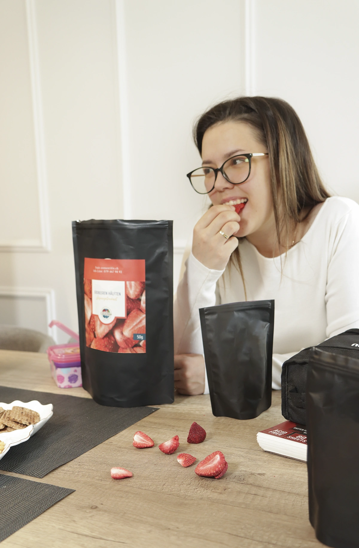 Feine, gesunde und knusprige Erdbeerhälften für die Liebsten als Znüni in der Kita, Schule oder Sport.