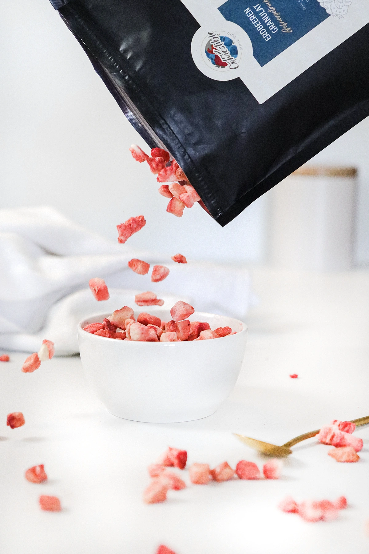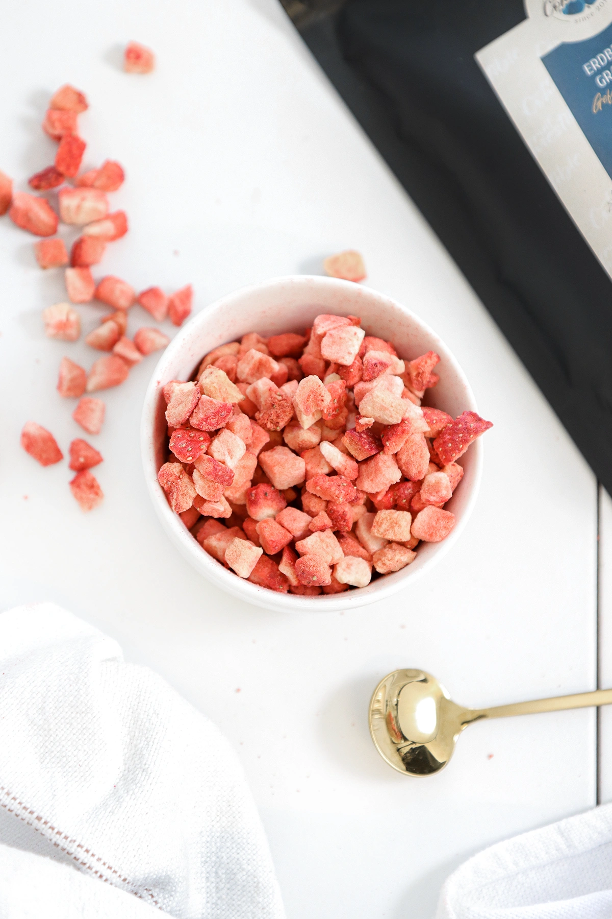 Gefriergetrocknete Erdbeeren können sehr vielseitig eingesetzt werden. Sehr einfach umzusetzten ist, wenn man bestehende Süssspeisen mit Pulver von gefriergetrockneten Früchten aromatisiert. Das Pulver von gefriergetrockneten Erdbeeren kann in sekundenschnelle als schmackhafte Sauce eingesetzt werden. Pulver von gefriergetrockneten Erdbeeren mit etwas Wasser und Puderzucker anrühren, kurz ziehen lassen und voila….fertig. Das Verhältnis beträgt ca. 15g Erdbeerpulver auf 70g Wasser. Beliebig mit 10g Puderzucker oder Kokosblütenzucker süssen. Wer noch mehr möchte, kann spannende Effekte bei der Textur erziehlen, in dem man Pulver von gefriergetrockneten Erdbeeren mit Granulat von gefriergetrockneten Früchten vermischt.