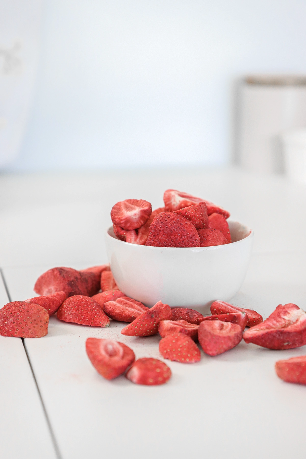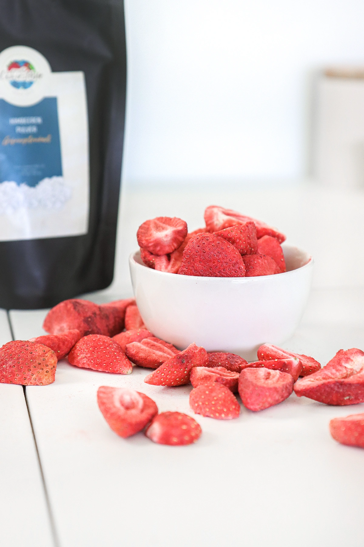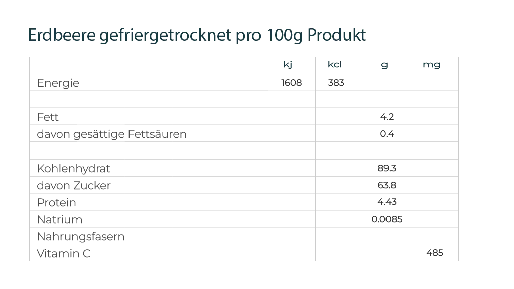 Bei gefriergetrockneten Erdbeeren, dies gilt grundsätzlich für alle gefriergetrockneten Früchte, verlieren einen grossen Teil ihres Gewichtes. Als Faustregel gilt bei gefriergetrockneten Erdbeeren, bzw. gefriergetrockneten Früchten, dass diese rund 90% ihres ursprünglichen Gewichts verlieren. Dieser Wert ist auch etwas davon abhängig, mit welchem Verfahren innerhalb der Gefriertrocknung die Früchte, bzw. Beeren gefriergetrocknet werden. Die gefriergetrockneten Früchte Produkte von fruit-Comestible weisen einen tiefstmöglichen Anteil an Restfeuchtigkeit auf, dies ist nebst dem Reifegrad ein absolutes Qualitätsmerkmal. Dadurch erhalten Sie den charakteristischen, typischen Knusper-Effekt beim Geniessen der gefriergetrockneten Erdbeeren. Die gefriergetrockneten Erdbeeren von fruit-Comestible sind so ernährungsphysiologisch hochwertig, dass die in der Frucht enthaltenen Enzyme wieder aktiv werden, sobald sie verarbeitet werden. Es empfiehlt sich grundsätzlich, wenn die gefriergetrockneten Früchte in Torten oder Crémen verarbeitet werden, die Fruchtmischung einmal zu erhitzten, um die Enzyme du deaktivieren. Aufgrund der hohen Dichte an Nährstoffen sind gefriergetrocknete Erdbeerenbeeren besonders auch für Smoothies geeignet. Aber vorsicht, es benötigt nicht viel, der Erdbeeren sind sehr ergibig.