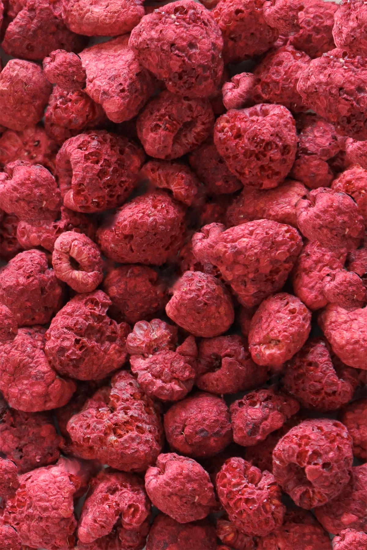 Bei gefriergetrockneten Himbeeren, dies gilt grundsätzlich für alle gefriergetrockneten Früchte, verlieren einen grossen Teil ihres Gewichtes. Als Faustregel gilt bei allen gefriergetrockneten Beeren, bzw. gefriergetrockneten Früchten, dass diese rund 90% ihres ursprünglichen Gewichts verlieren. Dieser Wert ist auch etwas davon abhängig, mit welchem Verfahren innerhalb der Gefriertrocknung die Früchte, bzw. Beeren gefriergetrocknet werden. Die gefriergetrockneten Früchte von fruit-Comestible weisen einen tiefst möglichen Anteil an Restfeuchtigkeit auf, dies ist nebst dem Reifegrad ein absolutes Qualitätsmerkmal. Dadurch erhalten Sie den charakteristischen, typischen Knusper-Effekt beim Geniessen der gefriergetrockneten Früchte. Die gefriergetrockneten Früchte von fruit-Comestible sind so ernährungsphysiologisch hochwertig, dass die in der Frucht enthaltenen Enzyme wieder aktiv sind, sobald sie verarbeitet werden. Es empfiehlt sich grundsätzlich, wenn die gefriergetrockneten Früchte in Torten oder Crèmen verarbeitet werden, die Fruchtmischung einmal zu erhitzten um die Enzyme zu deaktivieren.