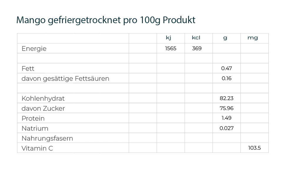 Bei gefriergetrockneten Mangos, dies gilt grundsätzlich für alle gefriergetrockneten Früchte, verlieren einen grossen Teil ihres Gewichtes. Als Faustregel gilt bei gefriergetrockneten Mangos, dass diese rund 90% ihres ursprünglichen Gewichts verlieren. Dieser Wert ist auch etwas davon abhängig, mit welchem Verfahren innerhalb der Gefriertrocknung die Früchte, gefriergetrocknet werden. Die gefriergetrockneten Mangos von fruit-Comestible weisen einen tiefstmöglichen Anteil an Restfeuchtigkeit auf, dies ist nebst dem Reifegrad ein absolutes Qualitätsmerkmal. Dadurch erhalten Sie den charakteristischen, typischen Knusper-Effekt beim Geniessen der gefriergetrockneten Früchten. Die gefriergetrockneten Früchte von fruit-Comestible sind so ernährungsphysiologisch hochwertig, dass die in der Frucht enthaltenen Enzyme wieder aktiv werden, sobald sie verarbeitet werden. Es empfiehlt sich grundsätzlich, wenn die gefriergetrockneten Früchte in Torten oder Crémen verarbeitet werden, die Fruchtmischung einmal zu erhitzten um die Enzyme du deaktivieren. Aufgrund der hohen Dichte an Nährstoffen sind gefriergetrocknete Früchten besonders auch für Smoothies sowie für besondere Ernährungsformen geeignet.