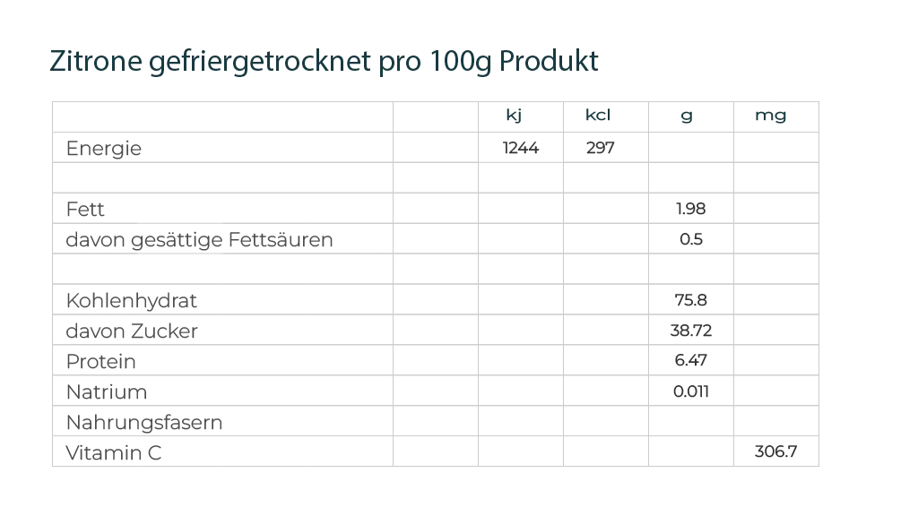 In der neuzeitlichen Ernährung nimmt die gefriergetrocknete oder frische Zitrone einen wichtigen Stellenwert ein. Die Inhaltsstoffe der gefriergetrockneten und frischen Zitrone unterstützen den Körper beim Entgiften und Entsäuern. Ein beliebter Start in den Tag ist Zitronenwasser. Es hilft das Immunsystem zu stärken und wirkt leicht entwässernd. Vitamine sind von Natur aus hitzeempfindlich, weshalb immer möglichst naturbelassen Zitronen verwendet werden sollte. Gefriergetrocknete Zitronen weisen praktisch alle hochwertigen Mikronährstoffe auf, wie frische Früchte.